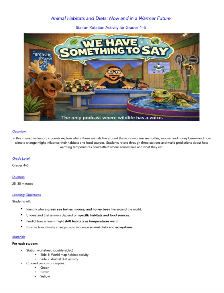 This lesson plan is designed as a follow-up to Episode One. Students will explore where Loretta, Nils, and Diego live and what they eat, then make predictions about how a changing climate may affect their habitats and food sources. Visit our activity sheets page to access the accompanying activity sheets for this lesson.